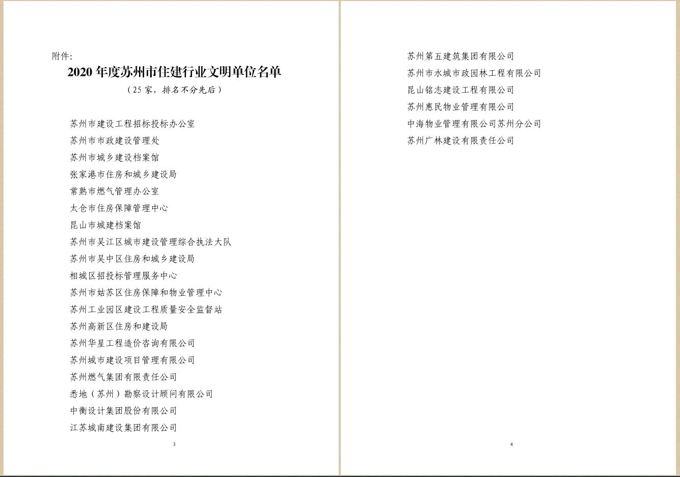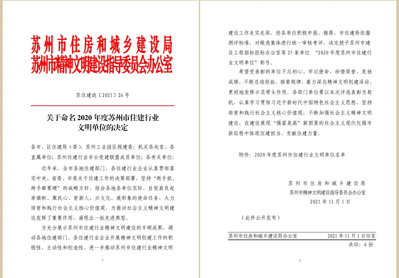 關于命名2020年度蘇州市住建行業文明單位的決定